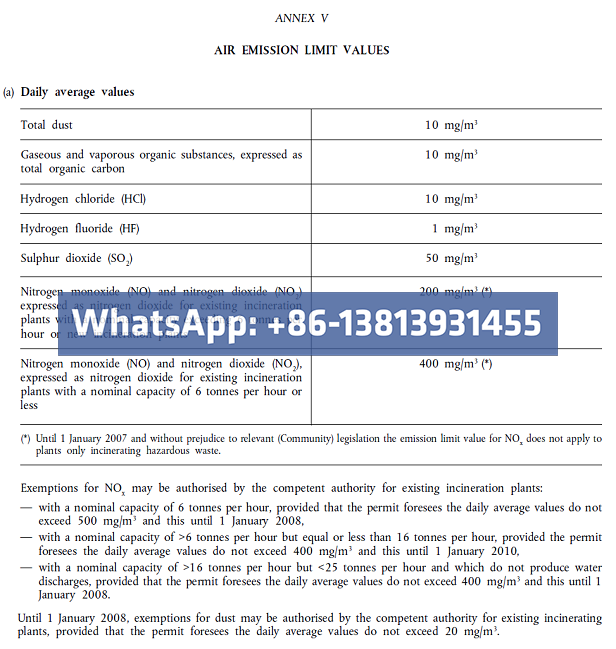 CO – Shouldn’t exceed 100 mg/m3 SO2 – Shouldn’t exceed 400 mg/m3 HF – (Hydrogen fluoride) Shouldn’t exceed 9.0 mg/m3 NO2 – Shouldn’t exceed 500 mg/m3 Smoke dust – Shouldn’t exceed 100 mg/m3 9 Height of the Incinerator – less than 10m above ground level 10 Manufacturer’s Warranty – less than 1 year 11 Electrical […]