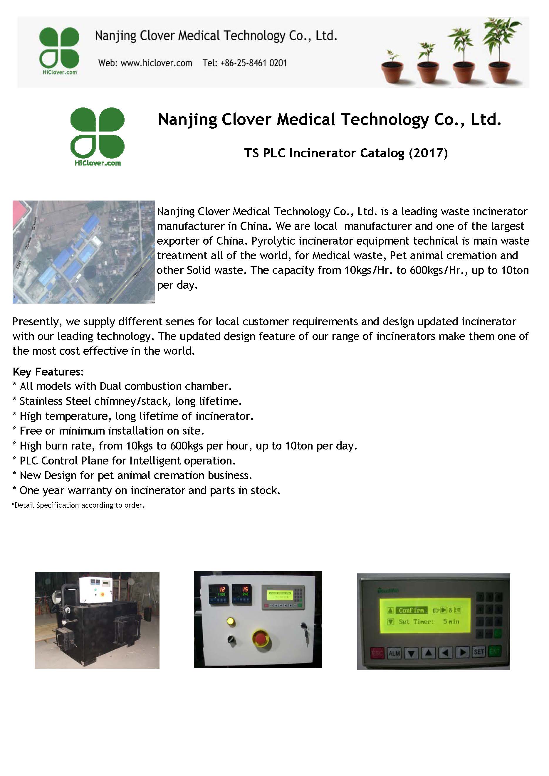 Items/Model TS10(PLC) TS20(PLC) TS30(PLC) TS50(PLC) TS100(PLC) Burn Rate (Average) 10 kg/hour 20 kg/hour 30 kg/hour 50 kg/hour 100 kg/hour Feed Capacity(Average) 20kg 40kg 60kg 100kg 200 kg Control Mode PLC PLC PLC PLC PLC Combustion Chamber 100L 210L 330L 560L 1200L Internal Dimensions 50x50x40cm 65x65x50cm 75x75x60cm 100x80x70cm 120x100x100cm Secondary Chamber 50L 110L 180L 280L 600L Smoke Filter Chamber Yes Yes Yes Yes Yes Feed Mode Manual Manual Manual Manual Manual Voltage 220V 220V 220V 220V 220V Power 0.5Kw 0.5Kw 0.5Kw 0.7Kw 0.7Kw Oil Consumption (kg/hour) 5.4–12.6 7.8–16.3 10.2–20 12.1–24 14–28 Gas Consumption (m3/hour) 6.2–11.4 8–15.7 9.8–20 9.9–26.1 10–32.2 Temperature Monitor Yes Yes Yes Yes Yes Temperature Protection Yes Yes Yes Yes Yes Oil Tank 100L 100L 100L 100L 200L Feed Door 30x30cm 45x40cm 55x50cm 70x55cm 80x60cm Chimney 3Meter 3Meter 5Meter 5Meter 10Meter Chimney Type Stainless Steel Stainless Steel Stainless Steel Stainless Steel Stainless Steel 1st. Chamber Temperature 800℃–1000℃ 800℃–1000℃ 800℃–1000℃ 800℃–1000℃ 800℃–1000℃ 2nd. Chamber Temperature 1000℃-1200℃ 1000℃-1200℃ 1000℃-1200℃ 1000℃-1200℃ 1000℃-1200℃ Residency Time 2.0 Sec. 2.0 Sec. 2.0 Sec. 2.0 Sec. 2.0 Sec. Gross Weight 1500kg 2200kg 3000kg 4500kg 6000kg External Dimensions 140x90x120cm 160x110x130cm 175x120x140cm 230x130x155cm 260x150x180cm